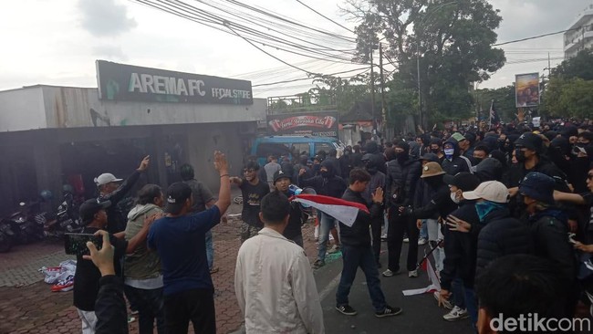 Puluhan Aremania menggelar demo di depan kantor Arema FC di Jalan Mayjen Panjaitan, Kota Malang. Demo berakhir ricuh.