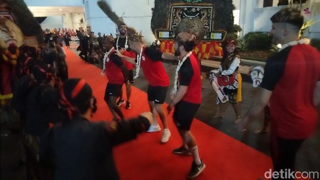 Satu per satu pemain diberi kalung bunga. Selanjutnya, mereka juga mendapatkan blangkon untuk dipasang di setiap kepala pemain.