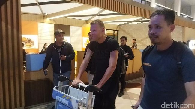 Mengenakan kaus hitam sambil mendorong troli kopernya, Josep tampak terus menebar senyum ke sejumlah orang yang menyambutnya. Sesekali ia berbincang dengan agennya, Gabriel Budi.