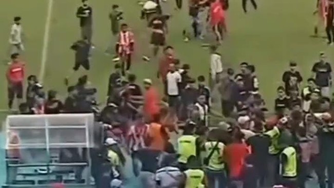 Dalam video yang beredar tampak puluhan suporter turun dari tribun dan merangsek masuk ke dalam lapangan. Steward yang berjaga di pinggir lapangan pun tak kuasa membendung.