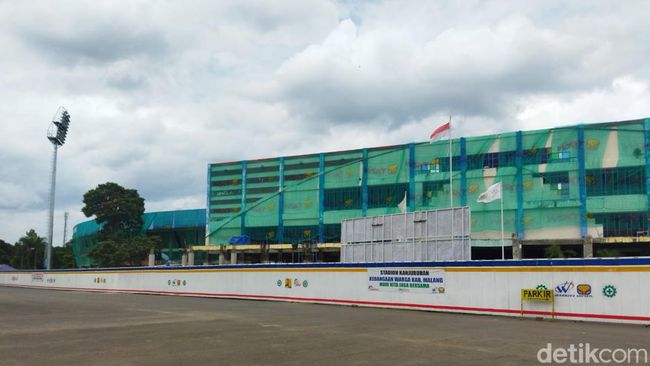 Terlihat dari area barat Stadion Kanjuruhan, proses pembangunan memang masih terus berlangsung. Pagar terbuat dari seng setinggi kurang lebih dua meter terpasang memutar di area stadion selama proses renovasi tersebut.