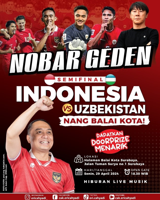 Diketahui, Timnas Indonesia U-23 akan bertemu Tim Uzbekistan U-23 dalam laga yang akan digelar besok (29/4/2024) pukul 21.00 WIB. Wali Kota Surabaya Eri Cahyadi mengajak warga Surabaya menyemarakkan dan mendukung skuad Garuda Muda, apa lagi Rizky Ridho dan Marselino Ferdinan adalah pemain asal Surabaya dan Persebaya.