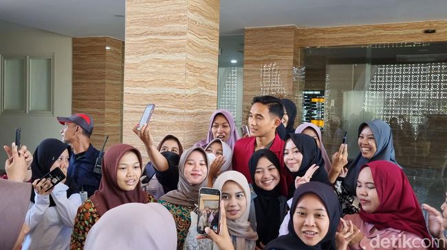 Kapten Timnas U-23 Rizky Ridho menjadi sasaran swafoto mahasiswi hingga dosen. Momen ini terjadi saat pemain Persija tersebut datang ke kampus Universitas Muhammadiyah (UM) Surabaya.