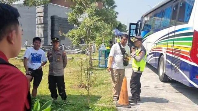 Polisi mencegat sejumlah bus suporter Persib di di Rest Area Tol KM 575 A Ngawi. Bus-bus itu diputar balik jelang laga final Madura United Vs Persib di Stadion Gelora Bangkalan.