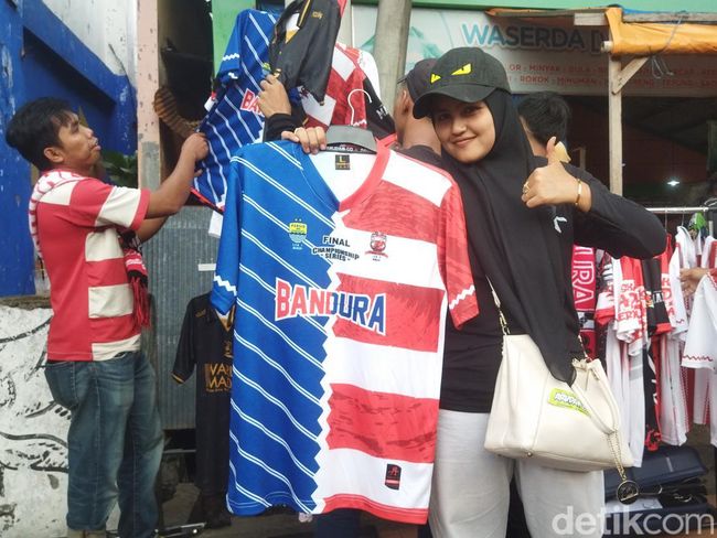 Linda (27) yang jualan jersei mengaku mendapatkan pundi-pundi keuntungan yang lumayan. Dia sudah menjual puluhan jersei ke suporter Madura United.