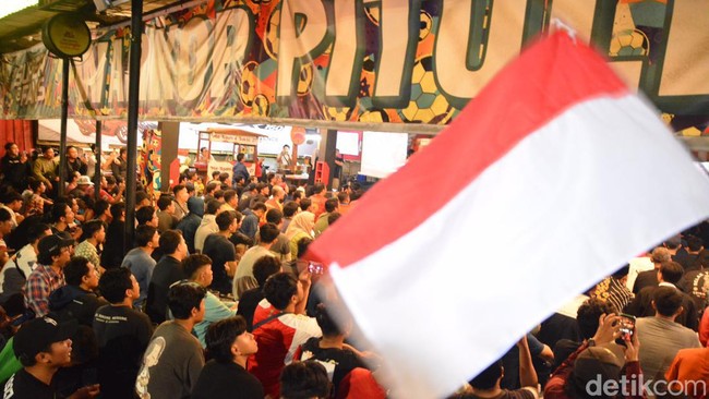 Pantuan tim detikJatim, suasana nobar nampak kondusif, bagian dalam warung kopi penuh, meluber hingga tepi Jalan Bagong Tambangan. Puluhan peserta nobar yang tak mendapati tempat duduk rela menonton sembari berdiri.