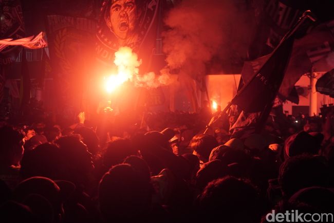 Puluhan flare dan petasan juga dinyalakan, menambah meriah suasana malam di Gelora 10 November. Suporter yang ingin mengabadikan momen kebersamaan ini tak ketinggalan merekamnya dengan ponsel mereka.