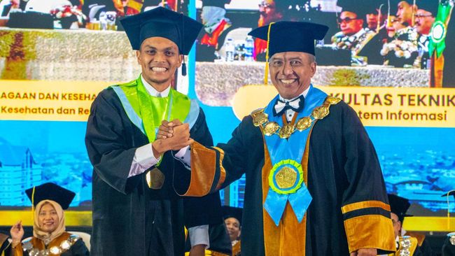 Pemain Timnas senior Rachmat Irianto semringah akhirnya lulus S-1 Pendidikan Jasmani, Kesehatan dan Rekreasi (PJKR) di Unesa. Dia diwisuda bersama ratusan wisudawan lain di Graha Unesa Kampus Lidah Wetan, Kamis (11/7/2024).