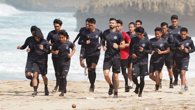 Arema FC memanfaatkan jeda kompetisi Liga 1 2024/2025 dengan menggelar pemusatan latihan. Para pemain Arema digenjot latihan fisik di Pantai Nganteb, Kabupaten Malang.
