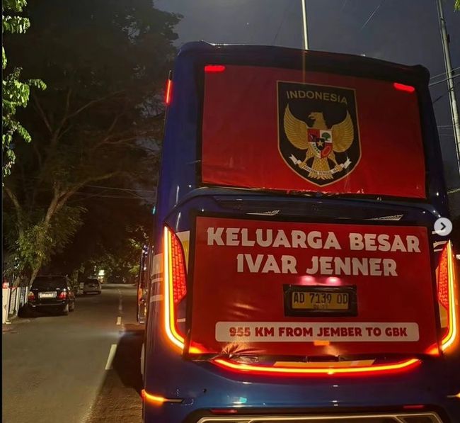 "KELUARGA BESAR IVAR JENNER. 955 KM FROM JEMBER TO GBK," tulis banner yang ada di belakang bus.