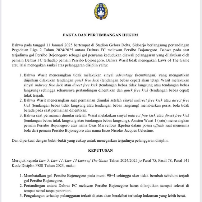 Komdis PSSI membuat keputusan tersebut berdasarkan salinan putusan merujuk kepada Law 5, Law 11, Law 13 Laws of The Game Tahun 2024/2025 jo Pasal 75, Pasal 78, Pasal 141 Kode Disiplin PSSI Tahun 2023.