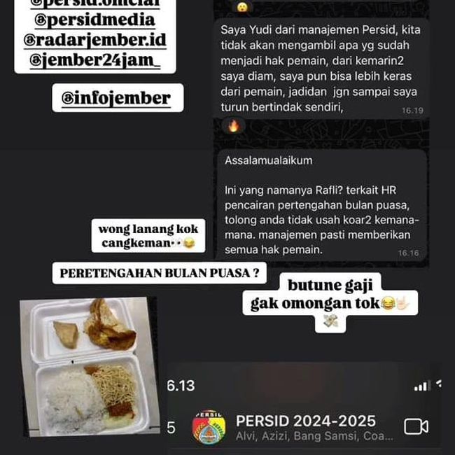 Dalam postingan tersebut tampak ada peringatan di Group Whatsapp PERSID 2024-2025 terhadap salah satu pemain Persid berinisial R agar tidak koar-koar mengenai gaji yang belum dicairkan.