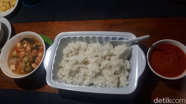 Malam ini, rombongan Jelajah Nusa makan malam dengan menu nasi putih, tom yam dan sambel andalan dari Muhamad Budiarto. Ia merupakan koki yang dipercaya menemani petualangan ini.