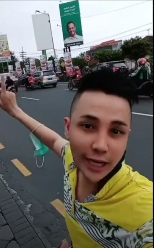 Sebelumnya pemuda berkaos kuning di pinggir jalan raya itu menyindir Baliho Anies Baswedan berlatar belakang warna hijau yang dia sebut 'Orang Yaman'.