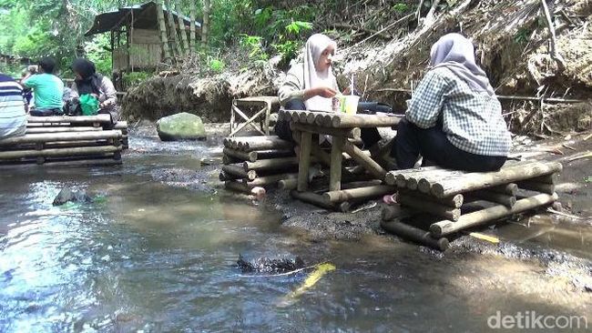 Di sini, pengunjung bisa memilih tempat duduk di aliran sungai yang jernih sambil menikmati suara gemericik air. Ada pula rindangnya pohon bambu yang turut menambah syahdu suasana.