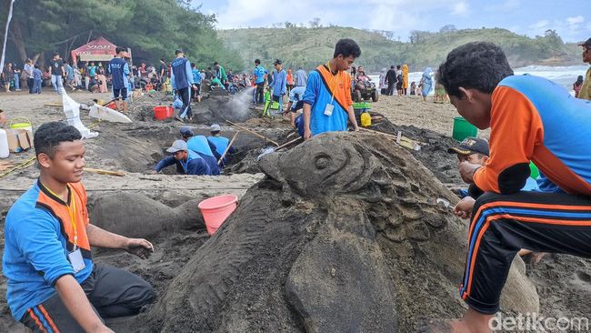 Festival patung pasir kembali digelar usai 2 tahun vakum akibat Pandemi COVID-19. Replika ikan koi, penyu, Candi Penataran hingga kendang dibuat para peserta dengan bahan pasir di Pantai Serang, Kecamatan Panggungrejo, Kabupaten Blitar.