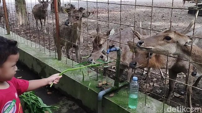 Puluhan rusa bisa dilihat langsung berkeliaran di balik pagar besi. Pengunjung juga bisa berinteraksi dengan memberi pakan yang disediakan pengelola. Ada kacang panjang dan kangkung yang seikat dijual Rp 2 ribu saja.