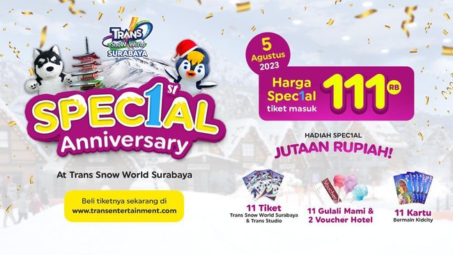 Selain salju yang turun di Surabaya, akan ada banyak promo dan hadiah menarik untuk pengunjung Trans Snow World Surabaya pada 5 Agustus 2023. Promo dan hadiah itu dalam rangka perayaan ulang tahun Trans Snow World Surabaya yang bertema "Spec1al Anniversary".