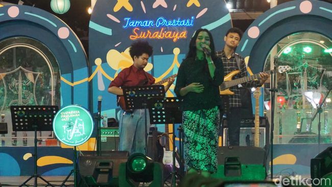 Pantauan detikJatim, masyarakat asyik terlihat menikmati penampilan sejumlah band lokal Jazz. Mereka terlihat asyik mengabadikan momen bersama keluarga.
