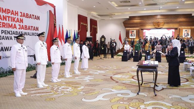 Gubernur Jawa Timur Khofifah Indar Parawansa resmi melantik dan mengambil sumpah jabatan enam penjabat (pj) bupati untuk kabupaten yang kepala daerahnya habis masa jabatannya. Pelantikan dan pengambilan sumpah enam pj bupati dibagi dalam dua sesi di Gedung Negara Grahadi Surabaya.