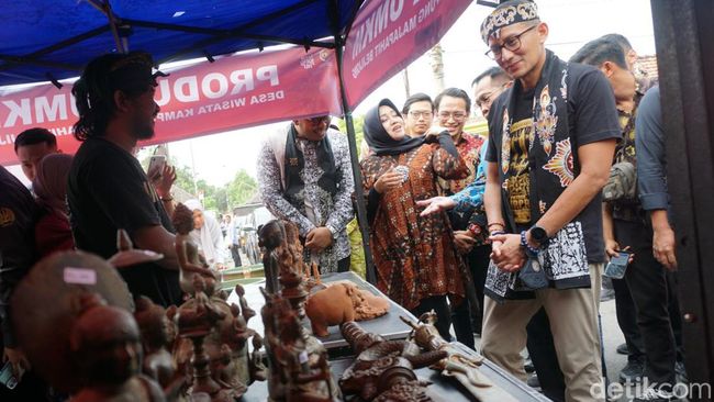 Kedatangan Sandiaga di Desa Wisata Kampung Majapahit Desa Bejijong disambut Bupati Mojokerto Ikfina Fahmawati dan emak-emak perajin patung cor kuningan. Ia sempat mencoba langsung proses membuat cetakan patung. Selanjutnya ia meninjau dan membeli sejumlah kerajinan khas Desa Bejijong.