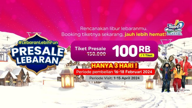 Kabar baiknya, Trans Studio Surabaya telah membuka pemesanan tiket presale spesial untuk libur Lebaran. Harga tiket presale-nya hanya Rp 100.000, dari harga normal Rp 150.000. Murah banget kan?