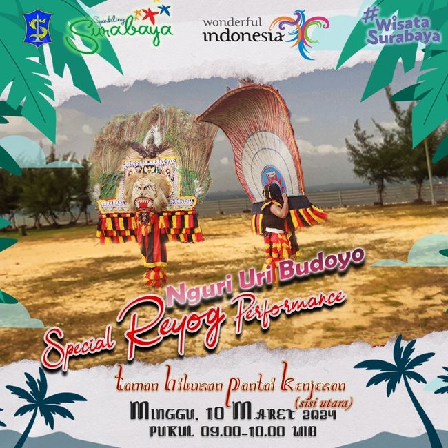 Pertunjukan spesial yang akan ditampilkan adalah Reog Performance Nguri Uri Budoyo. Acara ini digelar Minggu (10/3) pukul 09.00 WIB hingga 10.00 WIB di sisi utara THP Kenjeran.