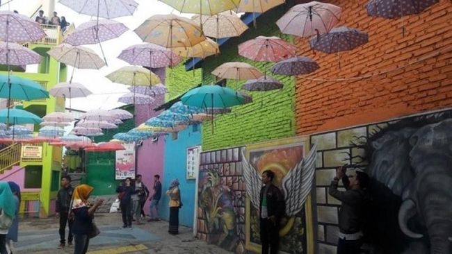 Satu lagi tempat wisata yang murah meriah, yaitu Kampung Warna Warni Jodipan. Rumah-rumah di sana dicat beraneka warna sehingga terlihat estetik. Kamu bisa mengajak keluarga berfoto dengan latar belakang rumah warna-warni.
