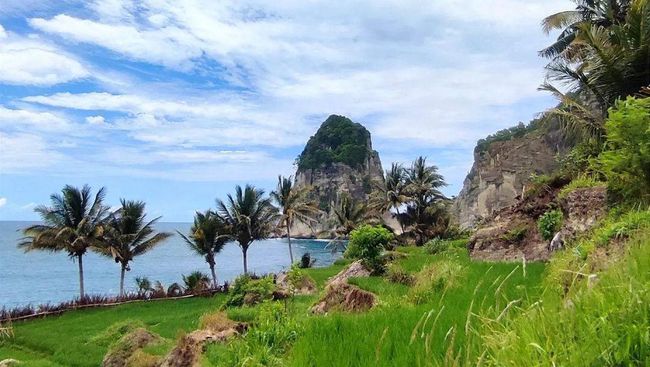 Pantai Pangasan di Pacitan memiliki sajian panorama alam yang lengkap. Mulai dari hamparan sawah dengan sistem terasering yang eksotis, tebing batu yang ikonik, hingga batu karang di bibir pantai.