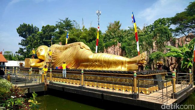 Patung berwarna emas ini memiliki panjang 22 meter dengan lebar 6 meter dan tinggi 4,5 meter. Posisi patung raksasa tersebut ada di tengah kolam ikan di area selatan Maha Vihara Mojopahit.