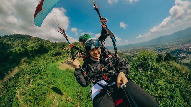 Terbang dengan paralayang di Gunung Menyan memberi pengalaman unik. Puncak gunung ini punya ketinggian 730 meter di atas permukaan laut.