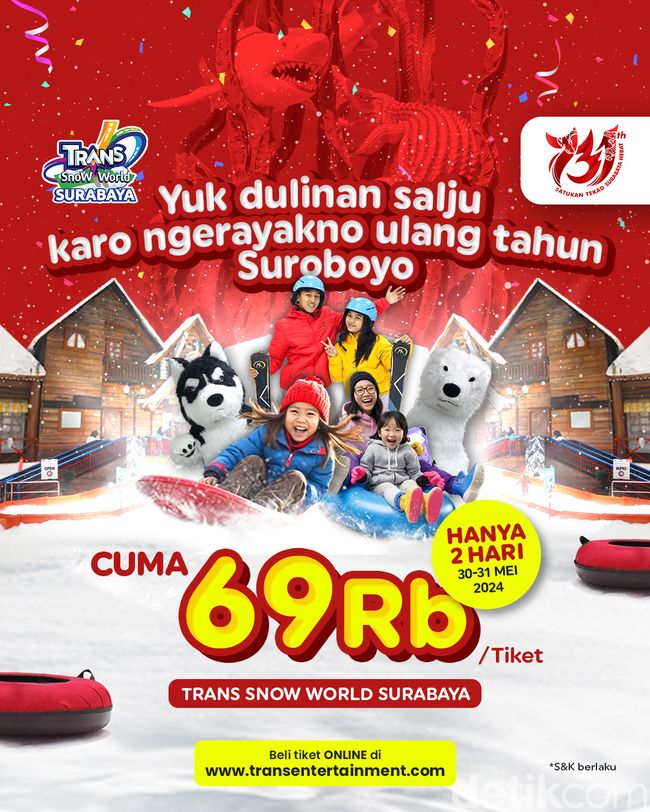 Ada kabar baik bagi warga Surabaya. Trans Snow World Surabaya turut menyemarakkan Hari Jadi Kota Surabaya (HJKS) ke-731. Wahana salju terbesar di Kota Pahlawan ini mengajak warga Surabaya dan keluarga untuk merayakan ulang tahun kota tercinta dengan bermain salju!