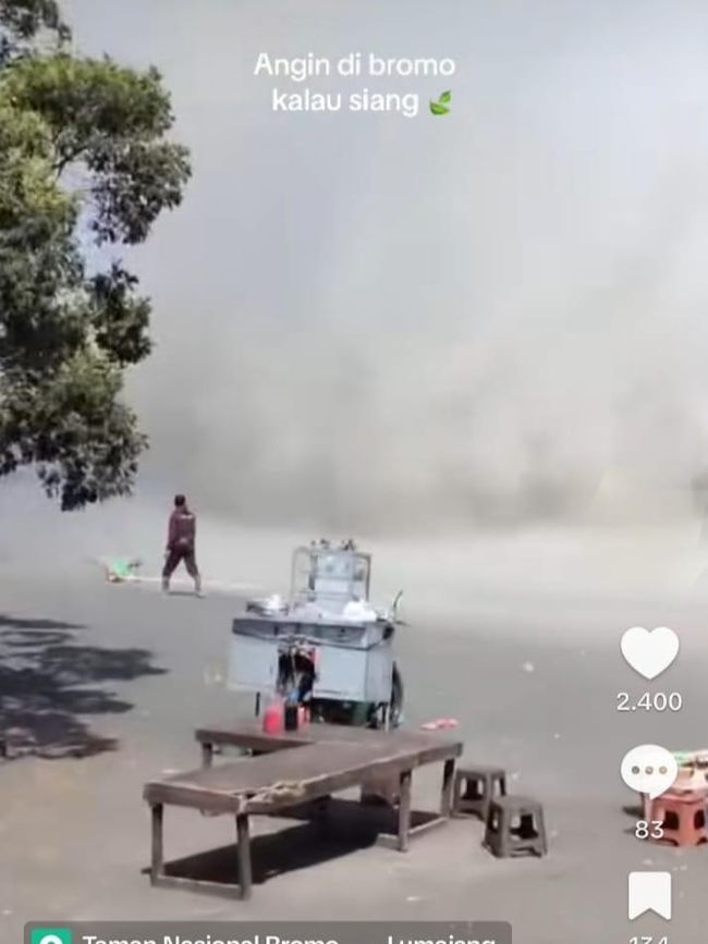 Sementara penjual kopi di sekitar lautan pasir itu tampak mengambil payung tenda jualannya yang juga terbawa angin. Bahkan tampak wisatawan bermain di sekitar lokasi.