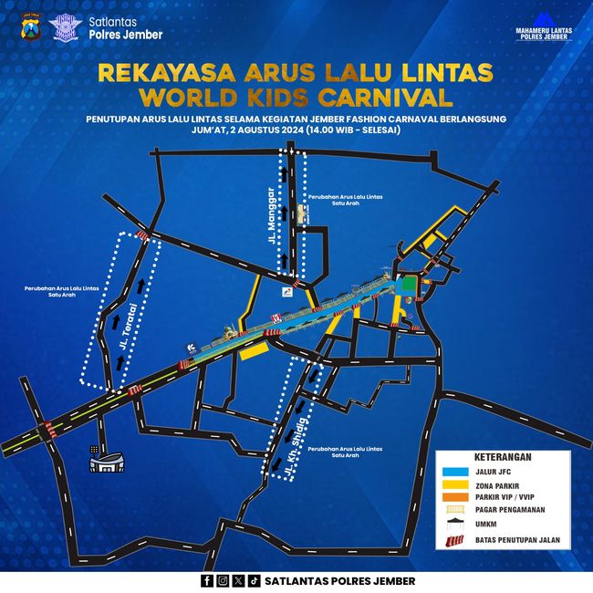 Satlantas Polres Jember membuat pola operasi rekayasa lalu lintas saat pagelaran Jember Fashion Carnival (JFC) pada 2 hingga 4 Agustus. Begini rekayasanya.