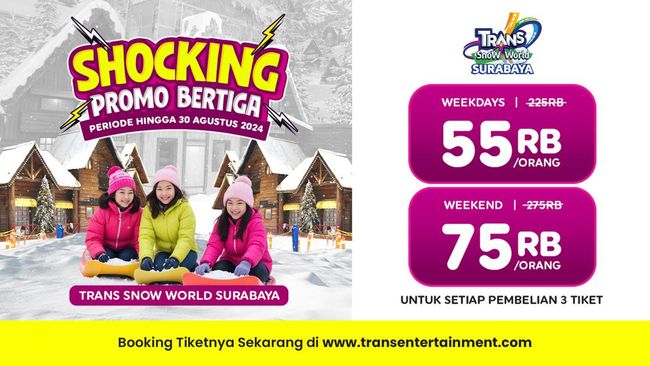 Trans Snow Surabaya menggelar promo hemat selama bulan Agustus 2024. Penawaran yang ditawarkan yakni Shocking Promo Bertiga dengan harga yang bikin dompet tetap aman.
