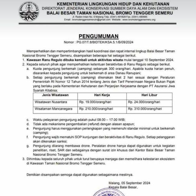 Meski sudah dibuka untuk wisata, namun Balai Besar TNBTS memberikan sejumlah ketentuan bagi para pengunjung. Ketentuan itu di antaranya: