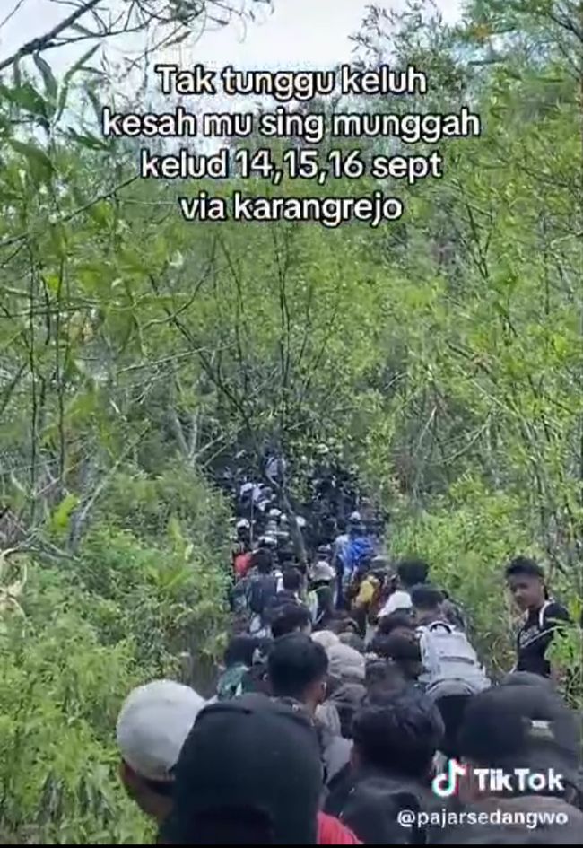 Dalam video yang diunggah akun tiktok @pajarsedangwo, terlihat sejumlah pendaki mengantre naik ke puncak Gunung Kelud. Tak hanya pendaki yang akan naik saja antre, tapi sejumlah pendaki yang turun juga tampak bergantian.