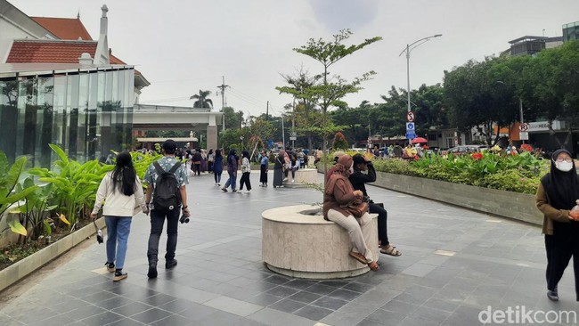 Pada malam hari, suasananya semakin hidup dengan lampu kota yang mempesona. Jalur pedestrian yang rapi dengan kursi istirahat menjadikan tempat ini nyaman untuk jalan santai sambil berfoto.