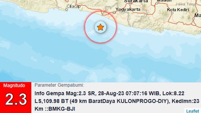 "Info Gempa Mag:2.3, 28-Aug-23 07:07:16 WIB," demikian dilansir akun resmi Twitter BMKG DIY @bmkgjogja, Senin (28/8/2023).