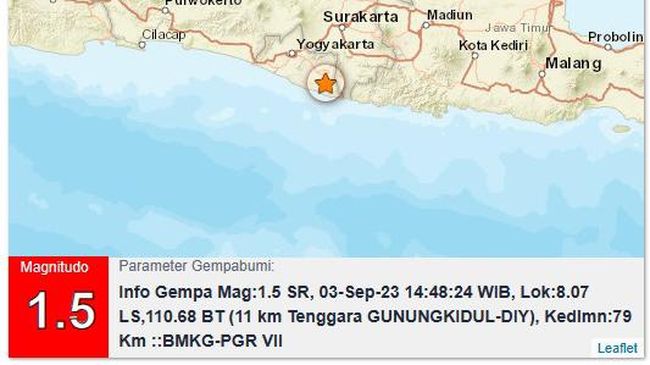 "Info Gempa Mag:1,5, 03-Sep-23," demikian dikutip dari akun resmi BMKG DIY @bmkgjogja, Minggu (3/9/2023).