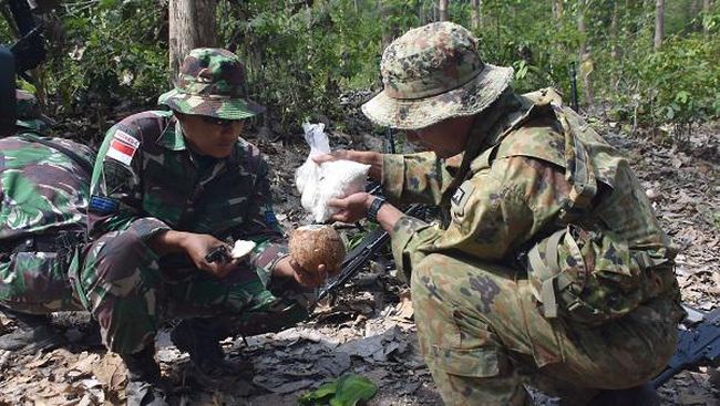 Tentara Singapura dan Jepang tampak antusias mengikuti materi latihan yang diberikan oleh Prajurit Korps Marinir TNI AL. Sempat ragu-ragu mencoba, para tentara asing itu akhirnya mencoba mengolah dan memakan makanan yang mereka dapatkan dari hutan Selogiri.