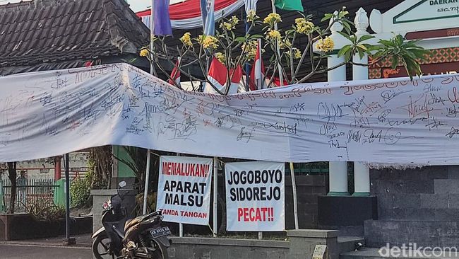 Baner itu berisi tanda tangan warga yang meminta Jagabaya Sidorejo untuk mundur dari jabatannya. Selain itu ada beberapa baner berukuran kecil. Di antaranya bertuliskan 'Memalukan!!! Aparat Malsu Tanda Tangan', 'Jogoboyo Sidorejo Pecat!!!'.