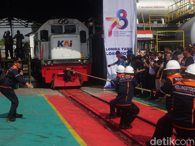 "Jadi ini cepat-cepatan, paling dulu sampai itu yang menang, jaraknya 15 meter. Ini masing-masing lokomotif beratnya 80 ton yang ditarik 10 orang dalam satu tim," bebernya.