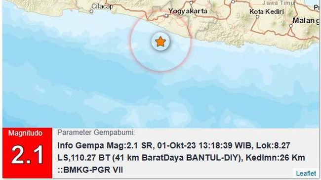 "Info Gempa Mag:2.1, 01-Okt-23," demikian dikutip dari akun resmi Twitter BMKG DIY @bmkgjogja, Minggu (1/10/2023).