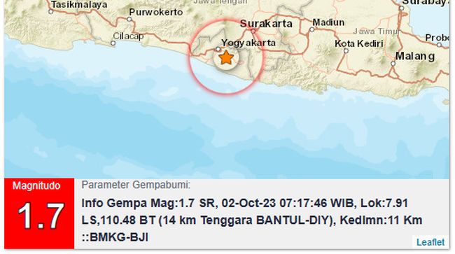 "Info Gempa Mag:1.7, 02-Oct-23," demikian dikutip dari akun resmi X (sebelumnya Twitter) BMKG DIY @bmkgjogja, Senin (2/10/2023).