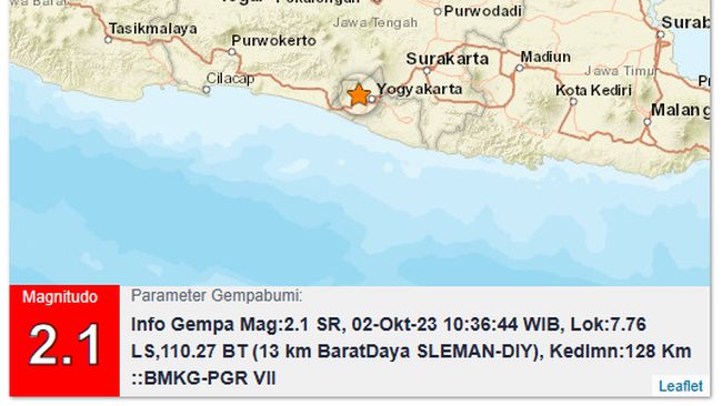 Gempa Bumi bermagnitudo 2,1 terjadi di Sleman, Daerah Istimewa Yogyakarta (DIY). Berikut ini data terkait gempa tersebut.