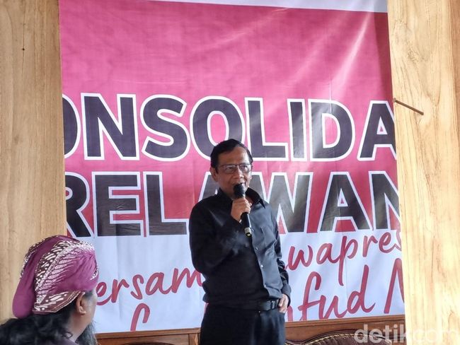 Mahfud mengatakan acara konsolidasi 42 kelompok relawan untuk capres cawapres Ganjar-Mahfud di Banguntapan, Bantul, hari ini begitu meriah. Kemudian, Mahfud tiba-tiba membeberkan tagline nama untuk Pilpres 2024.