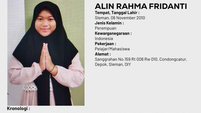 Berdasar informasi dari akun media sosial X milik Polda D.I. Yogyakarta, @PoldaJogja (2/11/2023), gadis yang hilang itu bernama Alin Rahma Fridanti, perempuan asal Condongcatur, Depok, Sleman. Laporan orang hilang ini tercatat di SPKT Polda DIY pada 1 November 2023 kemarin.