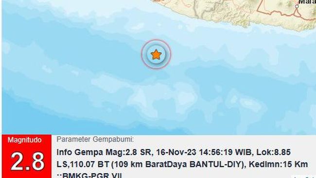 Gempa bumi berkekuatan magnitudo 2,8 terjadi di Bantul sore ini. Gempa ini berpusat di perairan.