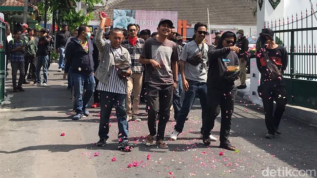 Massa juga sempat melakukan tabur bunga sebelum masuk kantor Satpol PP. Lalu mereka kembali berorasi di depan kantor Satpol PP.